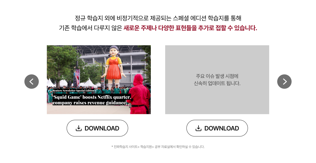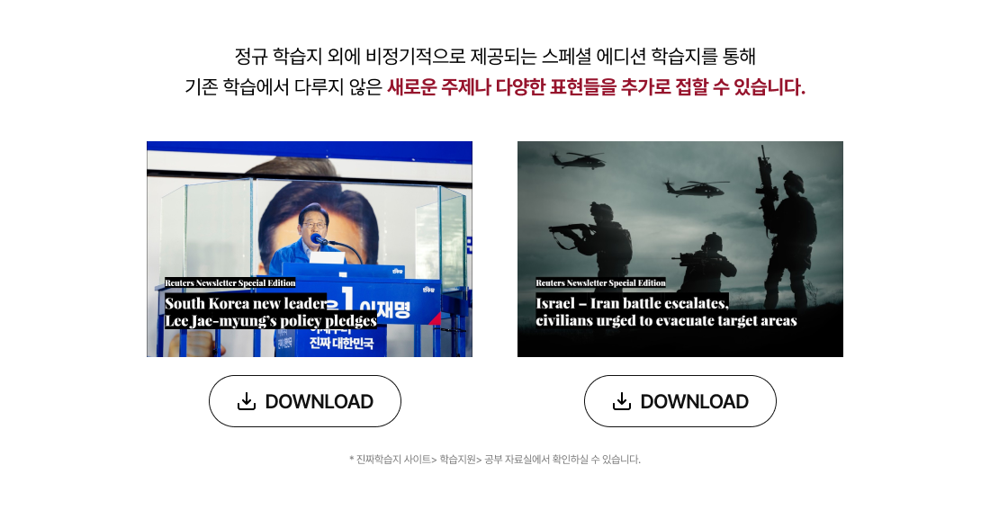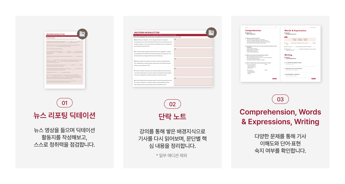 학습단어장 (PDF) - 6권 단락노트 (PDF) – 3권 뉴스 리포팅 딕테이션 (PDF) - 6권 로이터 뉴스레터 팟캐스트 |